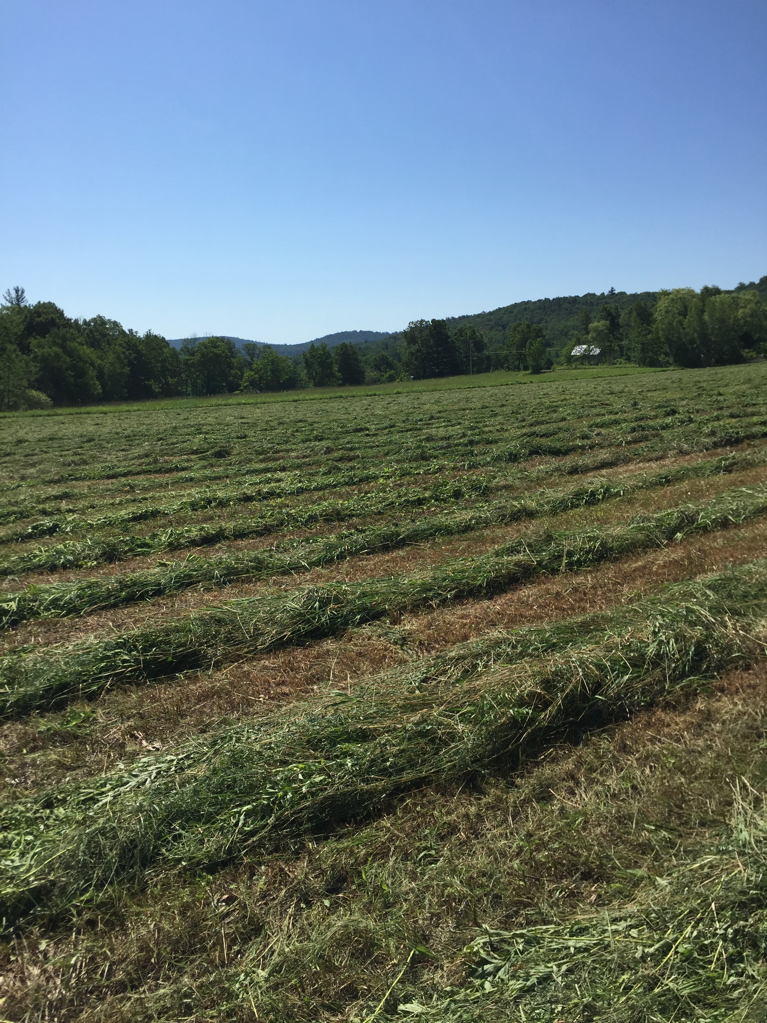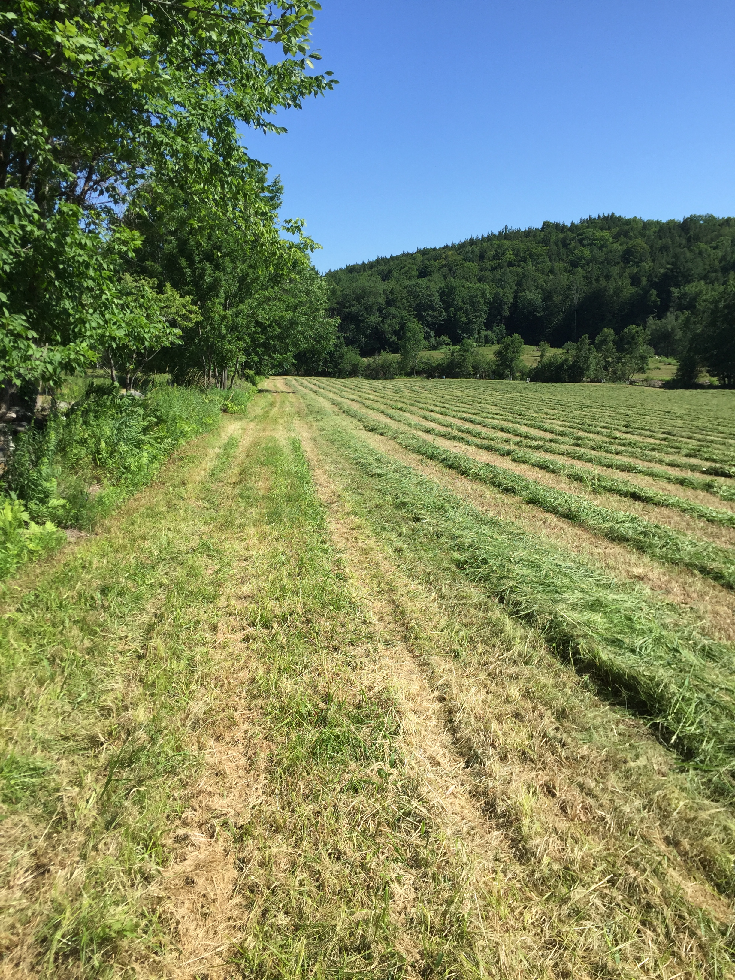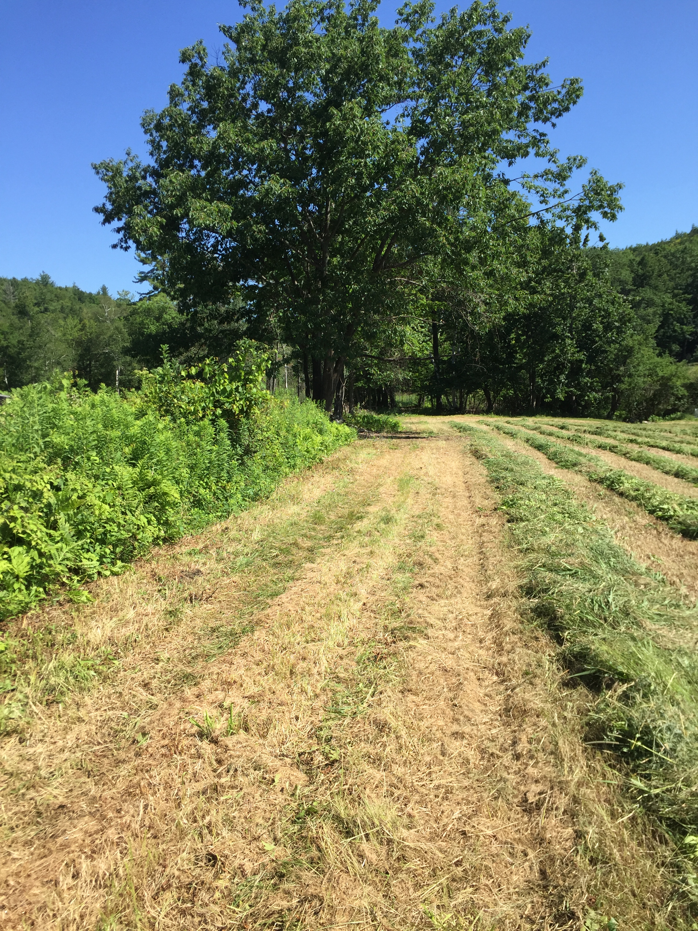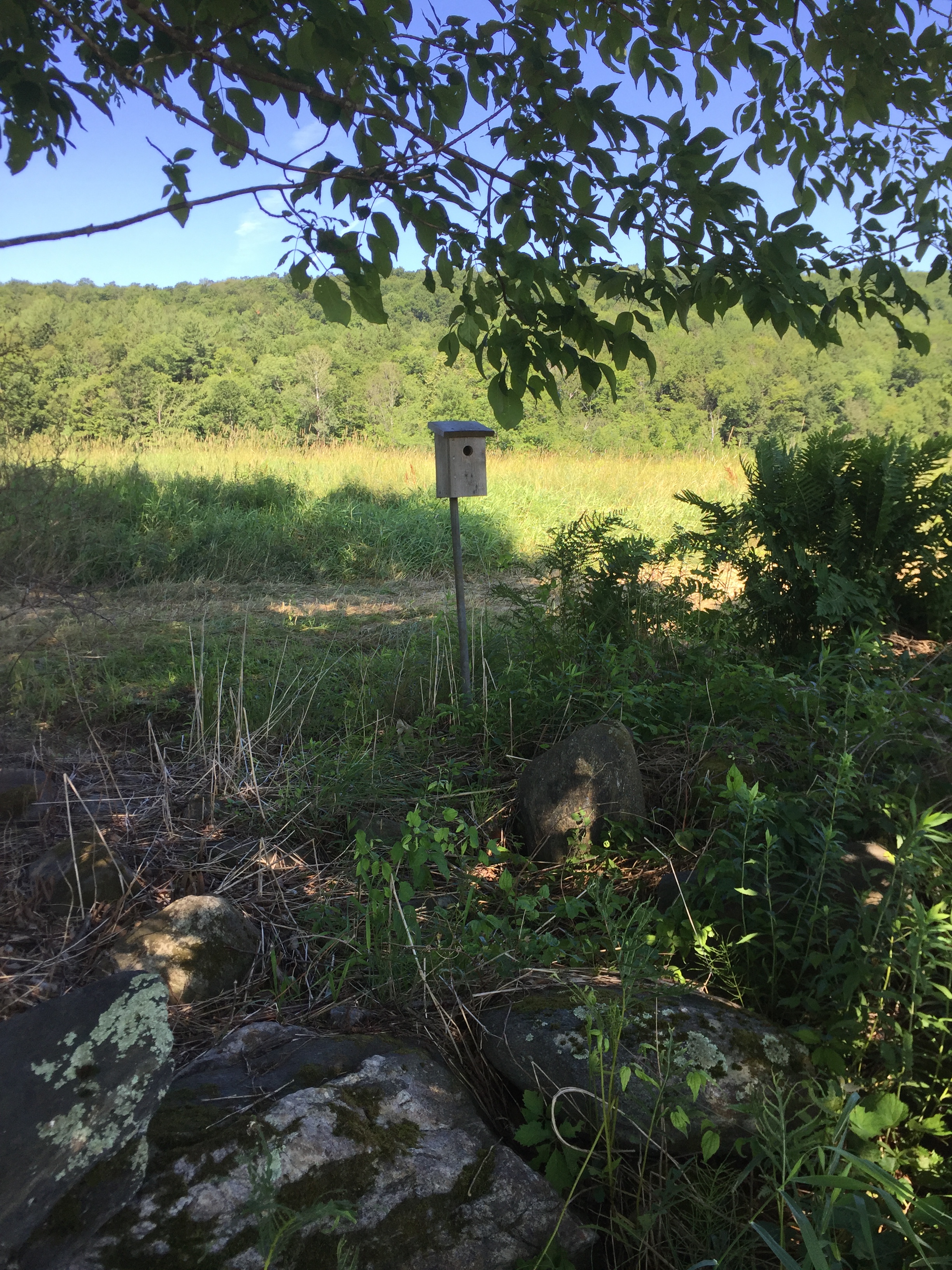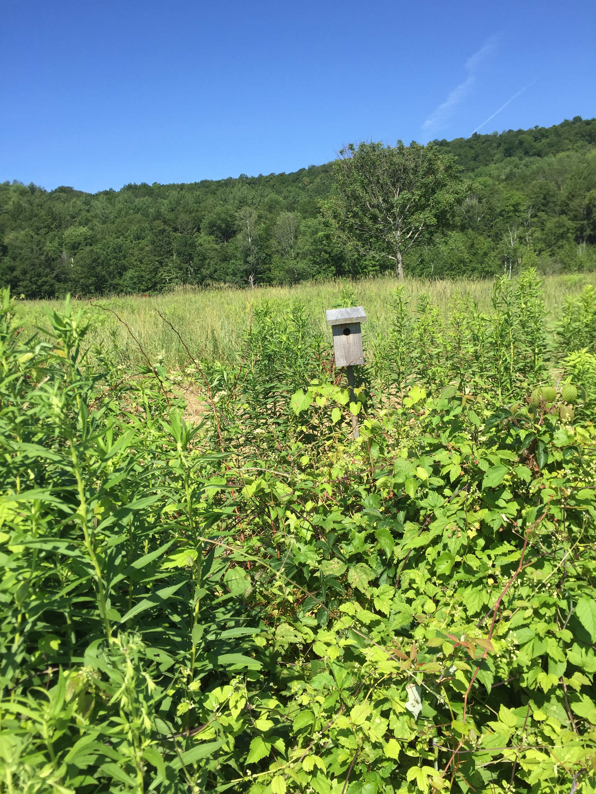 We planted a few apple trees out in the back pasture. The week after planting them was pretty dry, so I walked out to check on the little fellas and water them when I found that the deer found them first. Every tree was devoid of leaves, a few of the trees had even been stripped of everything but their main stalk. So I found some old bird netting to cover the trees – all of which recovered fine. Below are some pictures of the hay fields and some bird boxes Liam and I put up last year.